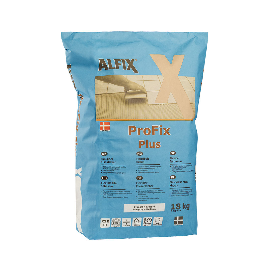 Alfix ProFix Plus er velegnet til gulv og væg, storformat- og porcellanatofliser, og den har et lavt forbrug pr. kvadratmeter samt en lagtykkelse på op til 10 mm.